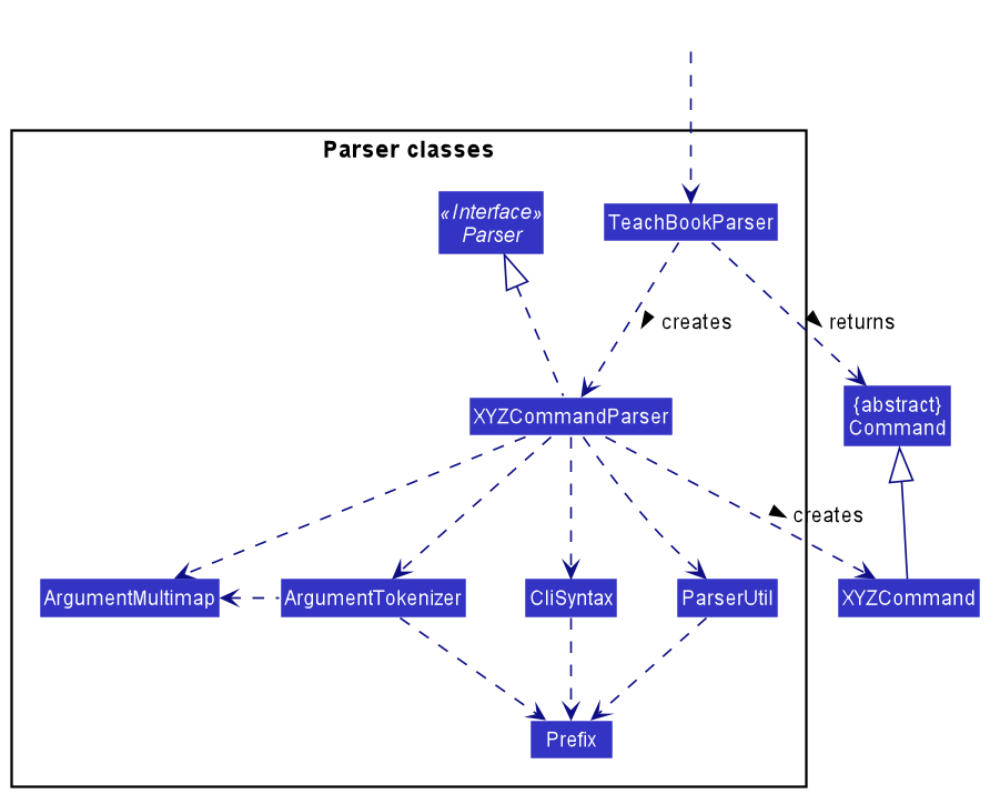 XYZCommandParserclasses (e.g.,AddCommandParser,DeleteCommandParser, …) inherit from theParserinterface so that they can be treated similarly where possible e.g, during testing.